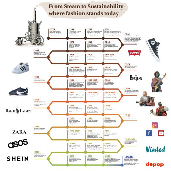 Today, in 2025, we stand on the threshold of the Fifth Industrial Revolution and the clash of two narratives. On the one hand, pressure grows for a circular economy – designing clothes from recycled materials, rental and resale, reducing waste. On the other hand, platforms like Shein still lure with ultra-cheap, disposable garments. History shows that every stage of industrialisation – from the steam engine to Instagram – has contributed to ever faster cycles of production and consumption. Will the new technological revolution help slow down this pace and harmonise fashion with the planet? That is a story whose next chapter is still being written.